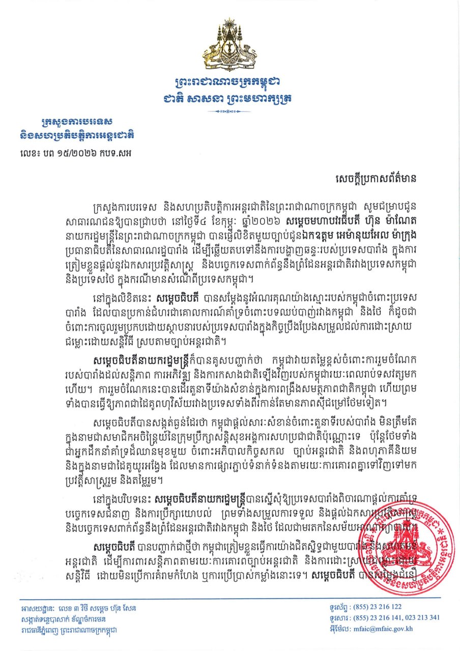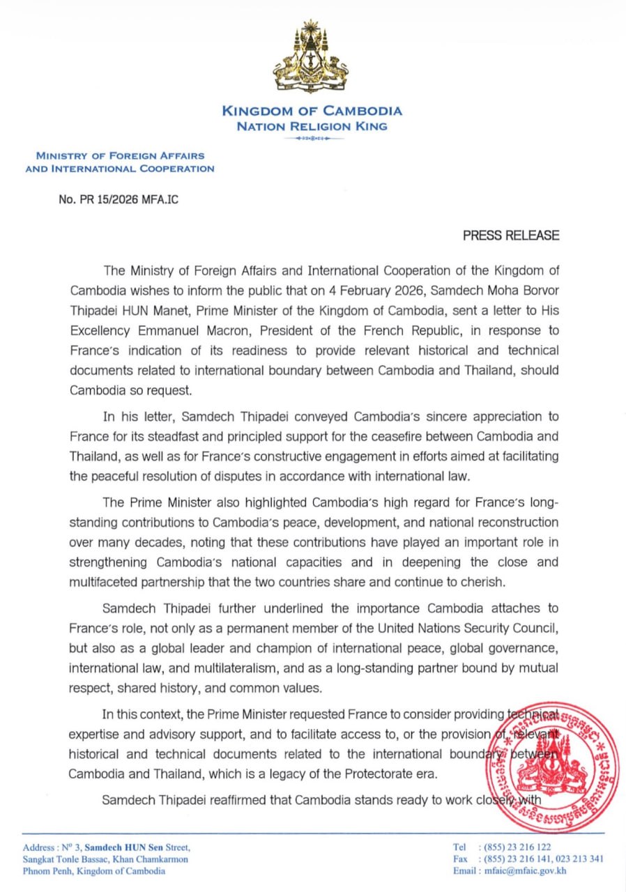 (ភ្នំពេញ)៖ សម្តេចមហាបវរធិបតី ហ៊ុន ម៉ាណែត នាយករដ្ឋមន្ត្រីនៃកម្ពុជា នៅថ្ងៃទី០៤ ខែកុម្ភៈ ឆ្នាំ២០២៦នេះ បានផ្ញើលិខិតមួយច្បាប់ជូន លោក អេម៉ានុយអែល ម៉ាក្រុង ប្រធានាធិបតីនៃសាធារណរដ្ឋបារាំង ដើម្បីឆ្លើយតបទៅនឹងការបង្ហាញឆន្ទៈរបស់ប្រទេសបារាំង ក្នុងការត្រៀមខ្លួនផ្តល់នូវឯកសារប្រវត្តិសាស្ត្រ និងបច្ចេកទេសពាក់ព័ន្ធនឹងព្រំដែនអន្តរជាតិរវាងប្រទេសកម្ពុជា និងប្រទេសថៃ។