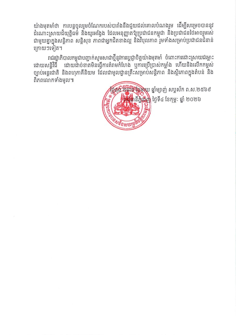 រាជរដ្ឋាភិបាលកម្ពុជា បានបញ្ជាក់សាជាថ្មីនូវការប្តេជ្ញាចិត្តយ៉ាងមុតមាំ ចំពោះការដោះស្រាយជម្លោះដោយសន្តិវិធី ដោយដាច់ខាតមិនធ្វើការគំរាមកំហែង ឬការប្រើប្រាស់កម្លាំង ហើយនិងលើកកម្ពស់ច្បាប់អន្តរជាតិ និងពហុភាគីនិយម ដែលជាមូលដ្ឋានគ្រឹះសម្រាប់សន្តិភាព និងស្ថិរភាពក្នុងតំបន់ និងពិភពលោកទាំងមូល៕